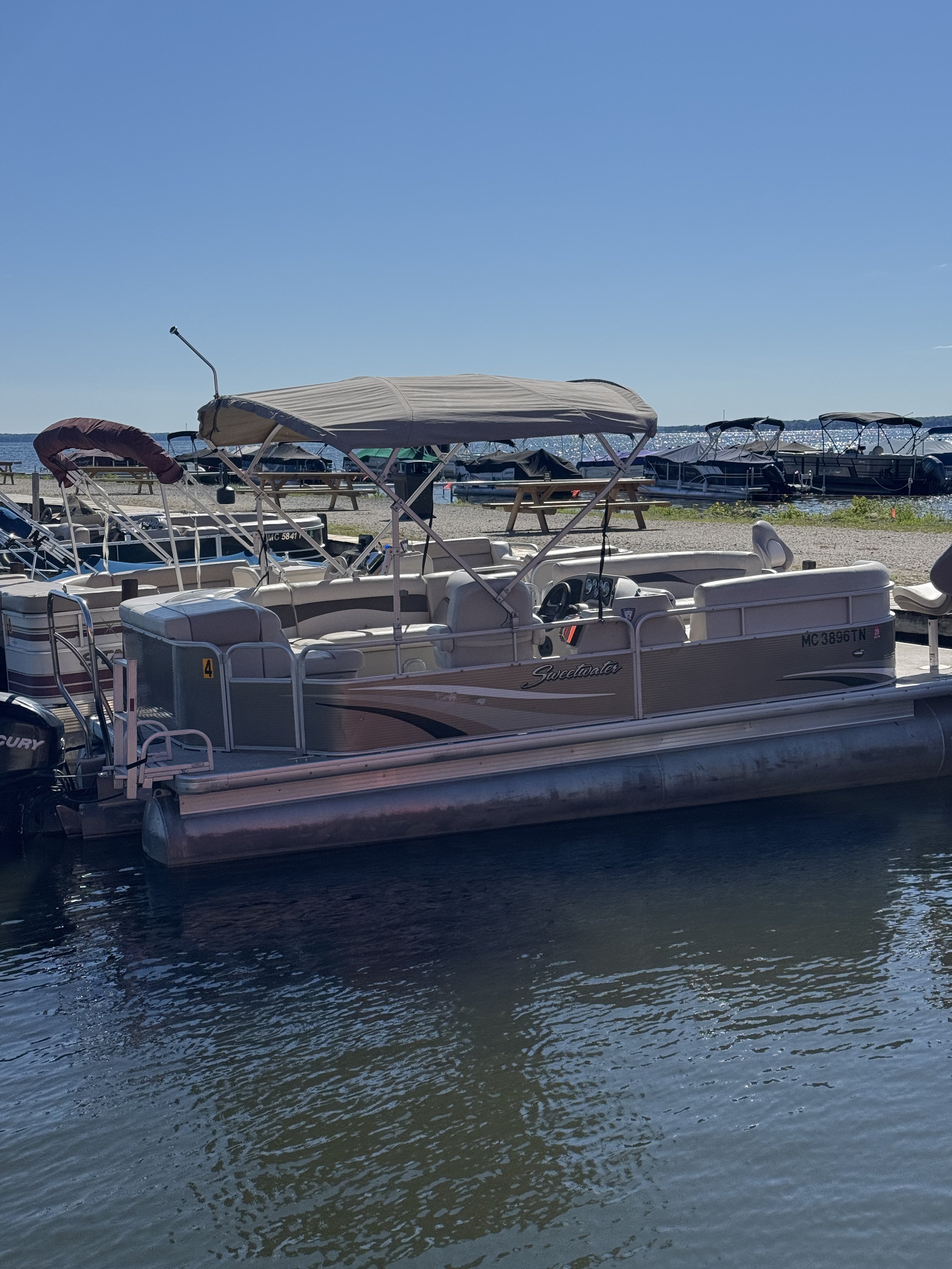 All of our pontoons are certified by the Roscommon County Sheriff and the Auxiliary Coast Guard, ensuring your safety on the water. Each boat accommodates up to 8 passengers and comes equipped with a Bluetooth-enabled sound system—perfect for enjoying your day on the lake.