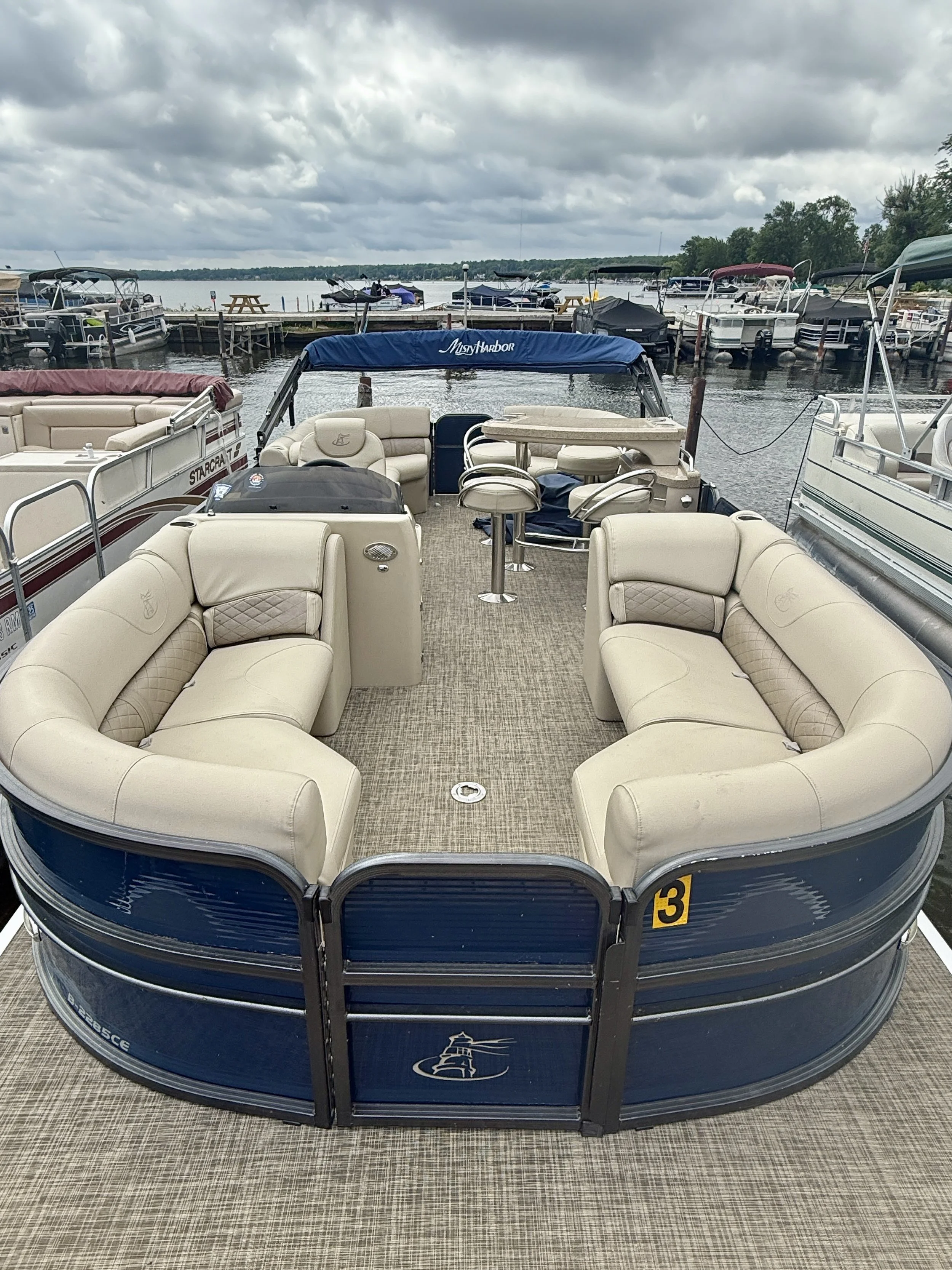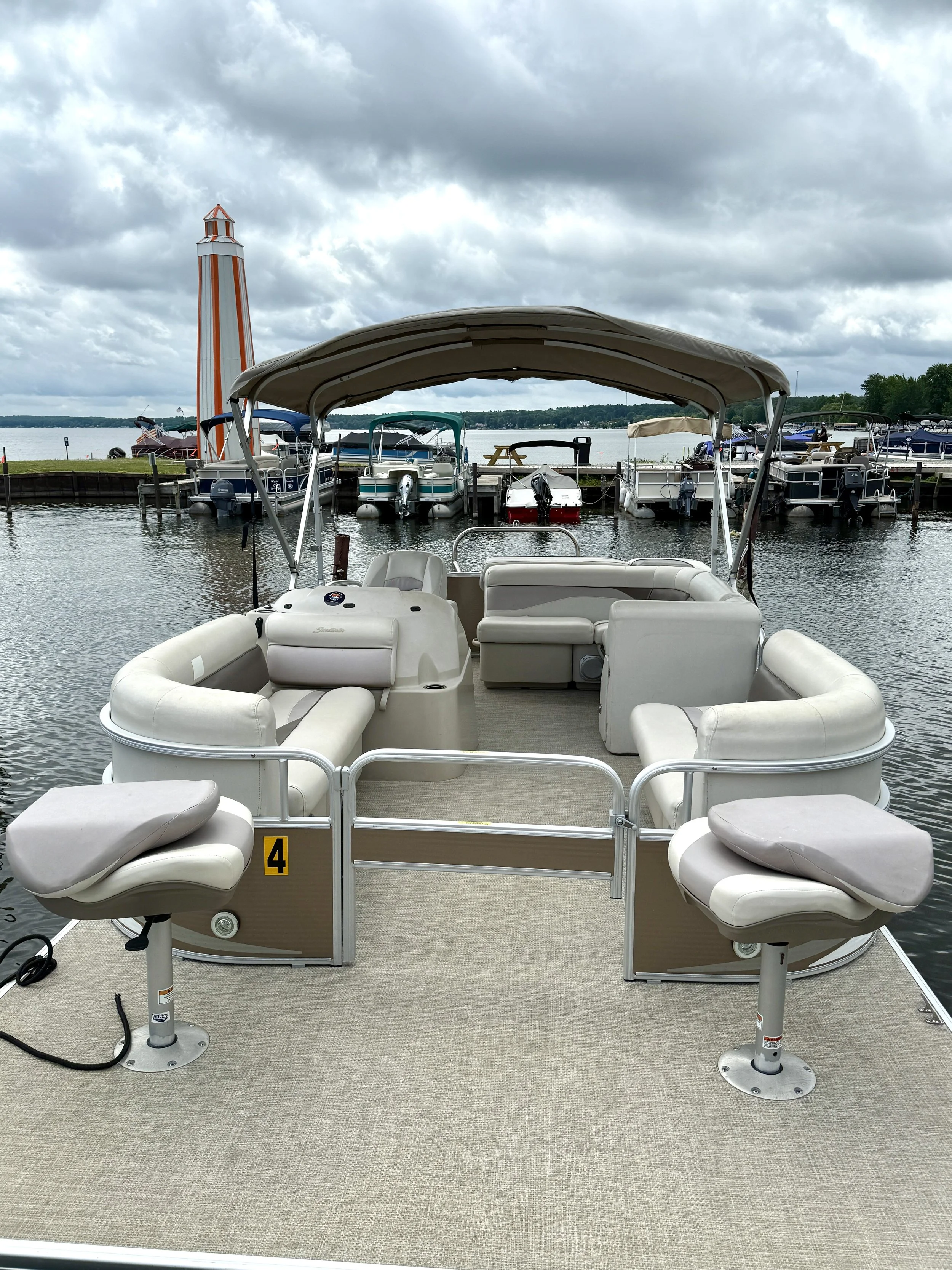 All of our pontoons are certified by the Roscommon County Sheriff and the Auxiliary Coast Guard, ensuring your safety on the water. Each boat accommodates up to 8 passengers and comes equipped with a Bluetooth-enabled sound system—perfect for enjoying your day on the lake.
